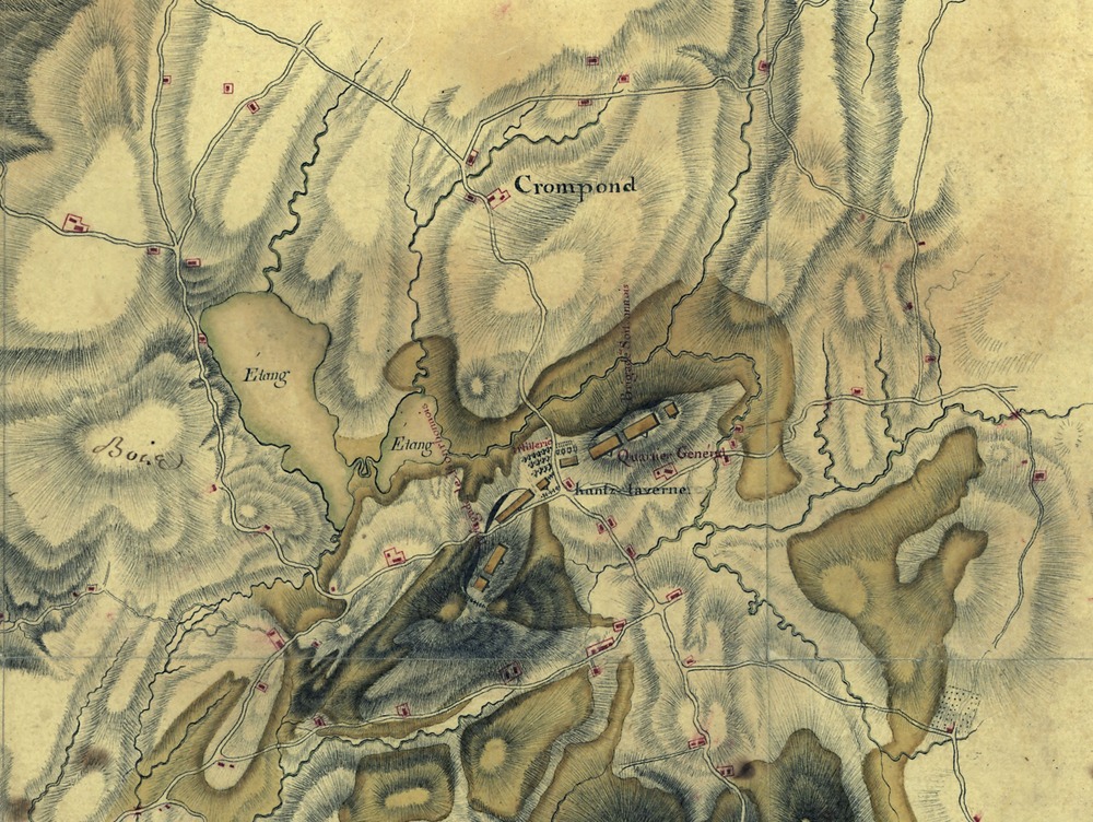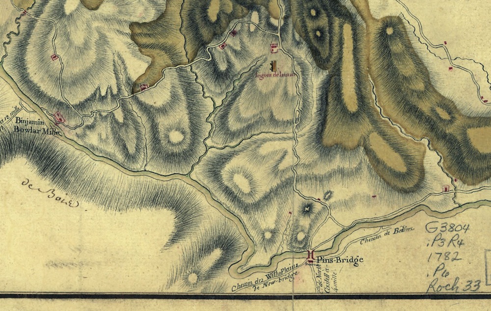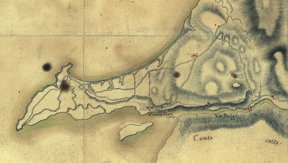 This manuscript map (meaning a hand-drawn map, rather than one which is printed) was made when the French army was camped in northern Westchester in 1782. It records in exquisite detail the roads, bridges, settlements and more between Croton in the southwest, Peekskill in the north and Yorktown in the northeast.