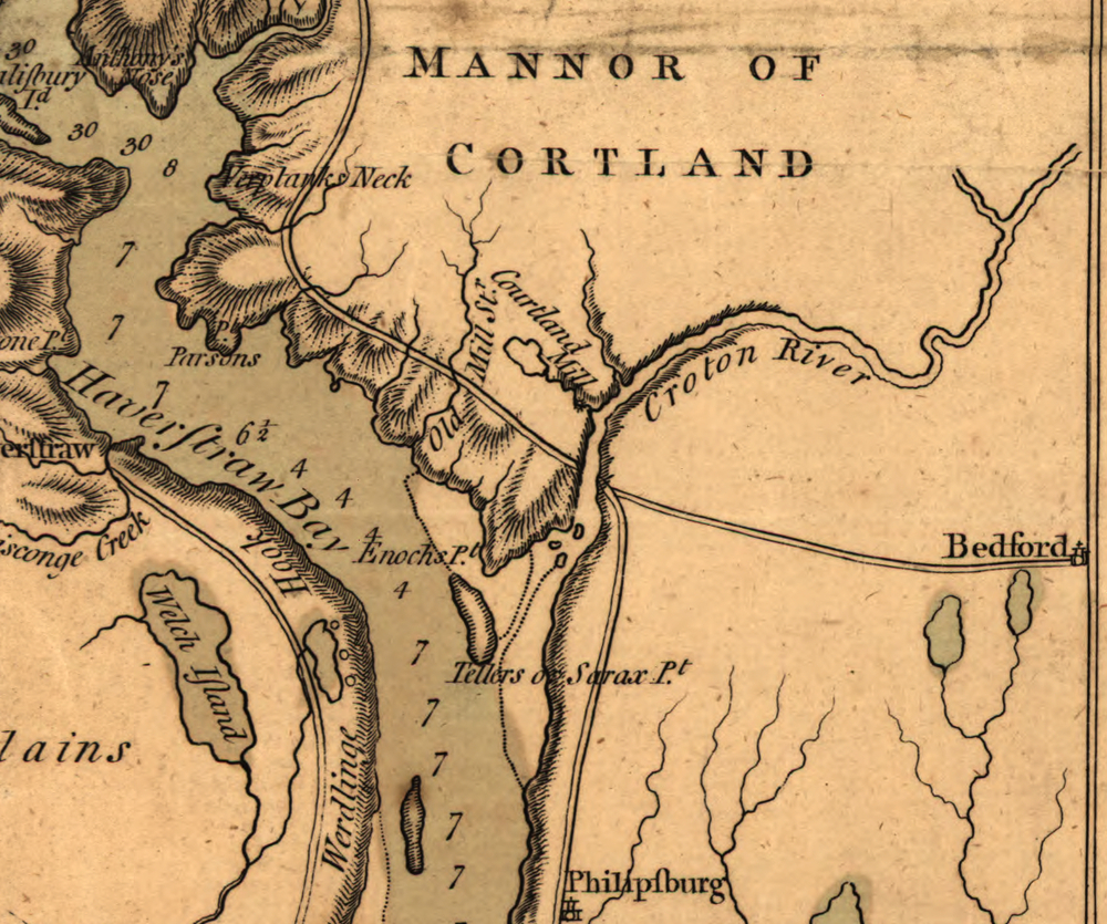Detail of the “Mannor of Cortland” from A topographical map of Hudsons River, with the channels depth of water, rocks, shoals &c. and the country adjacent, from Sandy-Hook, New York and bay to Fort Edward, also the communication with Canada by Lake George and Lake Champlain, as high as Fort Chambly on Sorel River. The map was made by Claude Joseph Sauthier and was published in London in 1777 by Willian Faden.