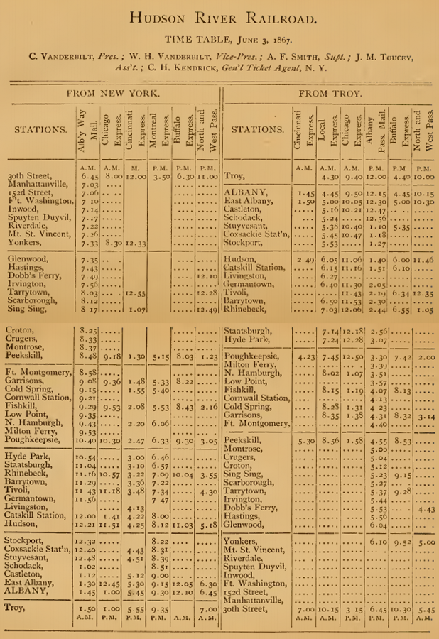 Below is the timetable from the same publication, listing Cornelius Vanderbilt as President and his son, William Henry Vanderbilt as Vice President.