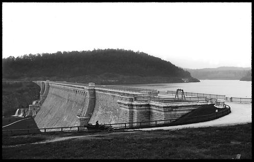 This is an often photographed view of the New Croton Dam, but this particular image from 1912 captured an automobile driving along the road which once ran across what is now the Old Croton Aqueduct Trail.