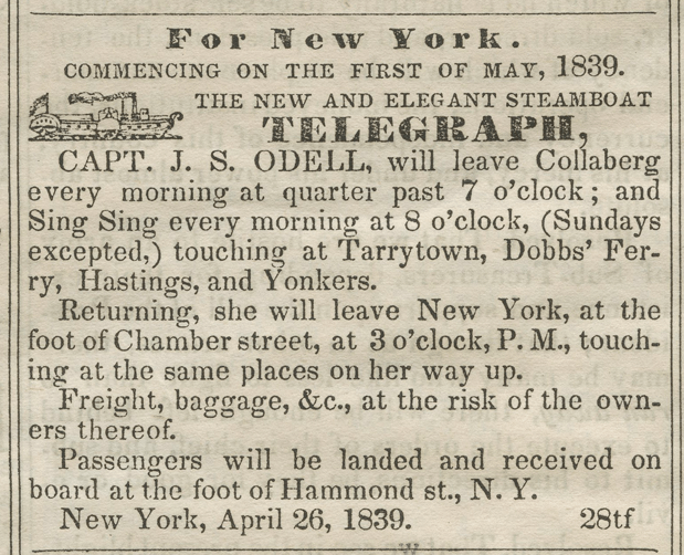 The Hudson River Chronicle was published in Sing Sing from 1837 until the 1860s and contains a wealth of information about the local area. The Ossining Historical Society generously granted access to one of their rare bound volumes so that these ads could be scanned. Visit their website at www.ossininghistorical.org