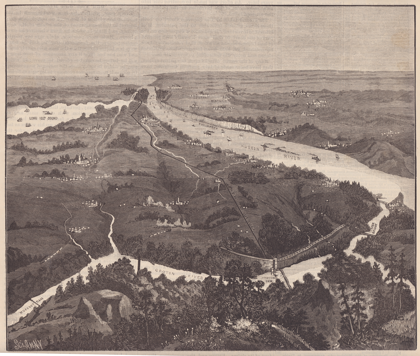 The cover of the June 4, 1887 issue of Scientific American featured a bird’s eye view map looking south, from the Putnam County border to New York City and beyond. The accompanying article said the map “clearly presents the course of the Croton River, the location of Muscoot, Croton, and the proposed Quaker Bridge dams, and in the dotted line shows the line of the old aqueduct and in the full black line shows the course of the new aqueduct.”