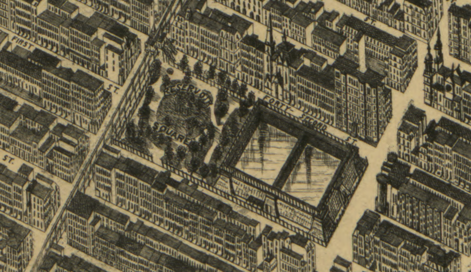 In a fascinating article about three-dimensional maps of New York City, the website Codex 99 calls this map “the first true attempt at a perspective map of the city . . . [The] four-sheet engraving, published by Galt & Hoy, attempted to label all roads and piers and depict buildings to (at least a more appropriate) scale using a vanishing perspective. It was a stunning achievement for the time.” 1 The map is so detailed that it shows all three major components of the Old Croton Aqueduct in New York City: