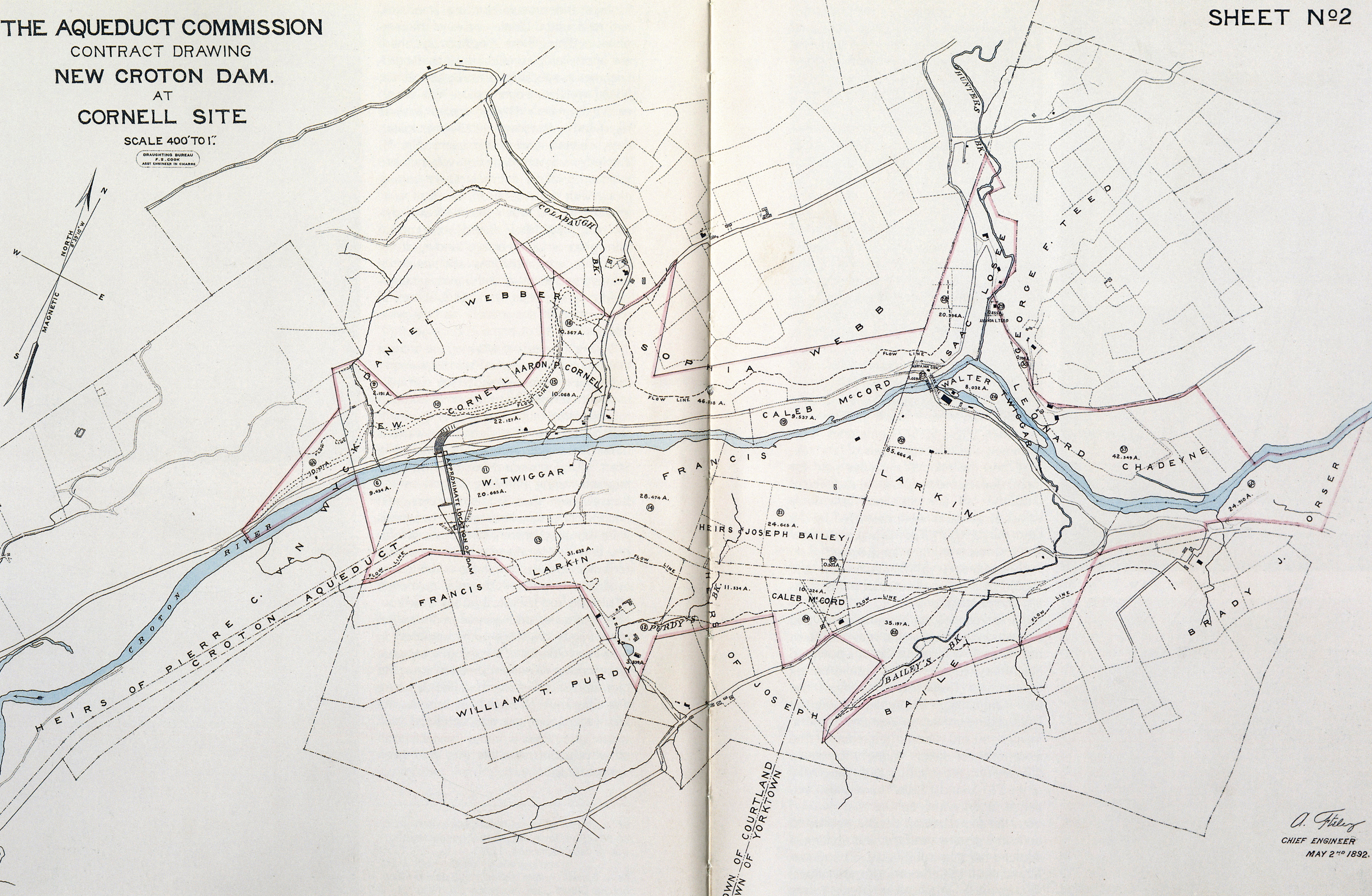 Contract drawing for the New Croton Dam at the Cornell Site, May 2, 1892. Click the image to enlarge it. What’s particularly interesting about this map is not the dam site itself, but the buildings, bridges and roads behind the dam which were destroyed when the valley was flooded.